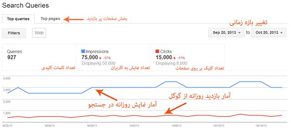 نمایش لیستی از کلمات کلیدی اصلی سایت شما که با جستجوی کاربران درگوگل صفحات شما نمایش داده شده اند. وبمستر گوگل تا 2000 کلمه کلیدی را که حداقل یک یا دوبار صفحات شما را به کاربران پیشنهاد داده اند در این بخش نمایش میدهد.