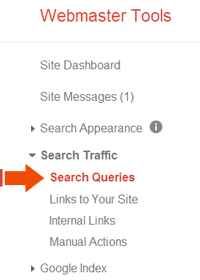 بخش Search Queries در قسمت Search Traffic از منوی سمت چپ وبمستر قابل دسترسی می باشد. این بخش که به شما اطلاعاتی در مورد جایگاه سایت خود برای کلمات کلیدی مختلف در نتایج جستجو، صفحاتی که بیشترین بازدیدکننده از گوگل را داشته اند و تغییر رتبه شما برای هر کلمه ارائه میدهد. بطور پیش فرض اطلاعات برای یک دوره 30 روزه نمایش داده میشوند و میزان تغییرات درواقع مقایسه دوره یک ماهه با دوره یک ماهه قبل می باشد.